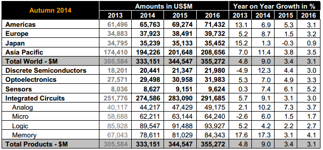 展望明後年,WSTS 認為只要全球總體經濟環境持續復甦,半導體產業仍大有可為,它與估 2015 年半導體產值將成長 3.4% 至 3,450 億美元,2016 年續增 3.1% 至 3,550 億美元。