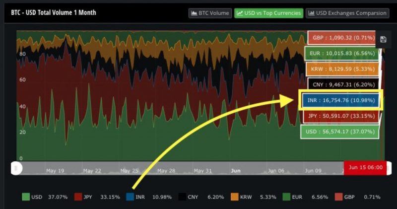 ARK Invest 主管 Chris Burniske 指出,印度政府公布決定之前,當地比特幣交易量大增。印度比特幣平台在美元交易的比特幣市場中,比重達 11%。