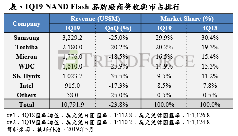 全球市場研究機構 TrendForce 記憶體儲存研究(DRAMeXchange)表示,今年第一季除了受到傳統淡季因素影響外,智慧型手機及伺服器 OEM 從 2018 年第四季開始便因需求疲弱而開始調節庫存,進一步使得各項產品的位元出貨量表現均呈現衰退,導致整體 NAND Flash 的合約價跌幅來到自 2018 年第一季以來最劇烈的一季。