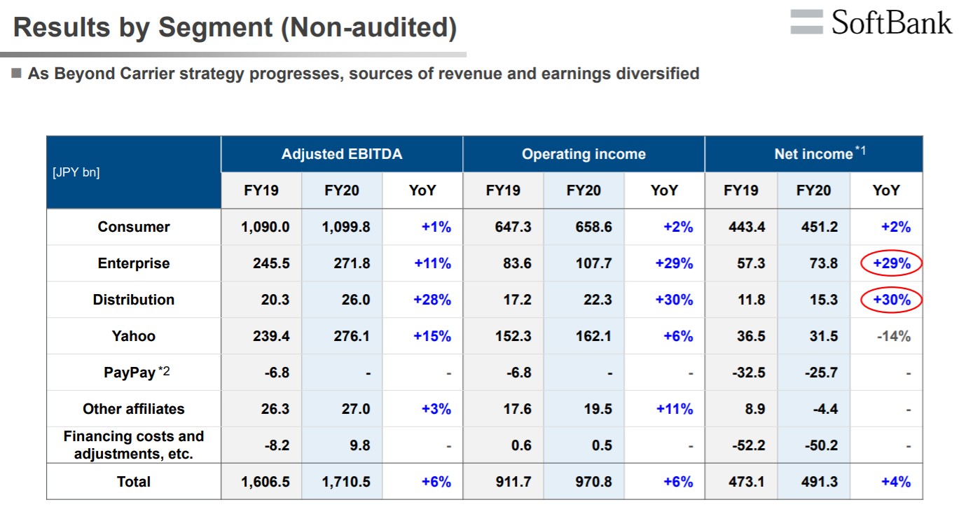 2020年度軟銀集團旗下電信事業「Softbank」獲利為8,479億日圓,而「願景基金」事業獲利高達4兆268億日圓。