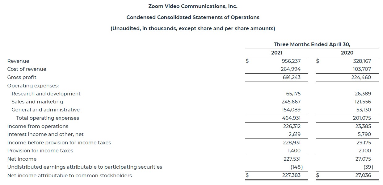 根據Zoom公佈的2022年會計年度第一季財報(截至2021年4月30日),當季營收9.562億美元,較去年同期的3.281億美元激增191%,優於分析師預期的9.060億美元;經調整後每股盈餘達1.32美元,亦高於分析師平均預期的0. 99美元。