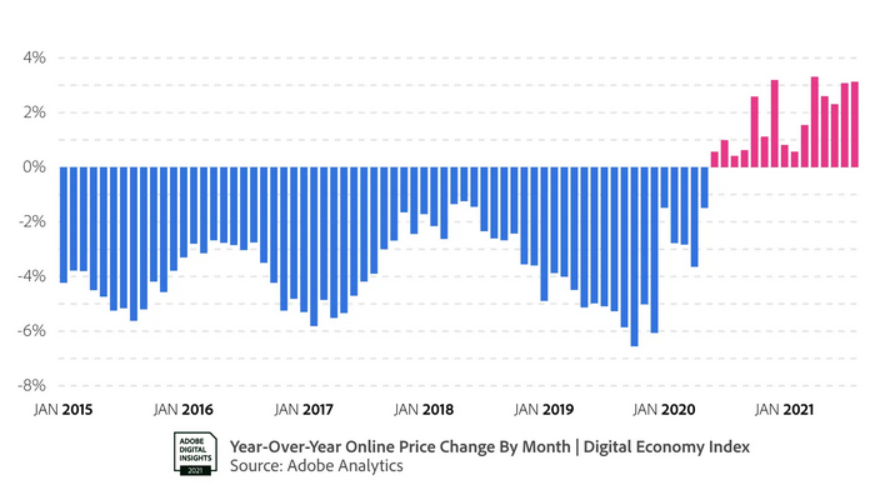 9月份美國零售網站的價格年增3.3%,一反過往多年同期的年減2~5%(見下圖)。儘管升幅仍低於9月份美國消費者物價指數(CPI)的年增5.4%,但是Schreiner強調,今年的「網路星期一」當週,價格可能會提高9%。網路星期一是11月底感恩節過後的週一,為網購高峰期。他說,網購買家習慣電腦的同店銷售價格,每年降低9%,「如同鐘擺一般」準時。可是今年類似裝置的要價,可能與2020年相同。