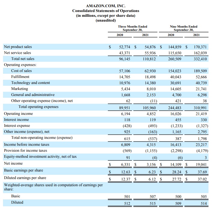 路透社、CNBC、Business Insider報導,亞馬遜28日盤後公布第三季(7-9月)財報:營收僅年增15%至1,108億美元,遠不如去年同期的37%年增率,主因消費者重返實體店、供應鏈挑戰干擾;每股稀釋盈餘達6.12美元,遠遜於去年同期的12.37美元。根據Refinitiv調查,分析師原本預測亞馬遜Q3營收、每股稀釋盈餘將達1,116億美元、8.92美元。