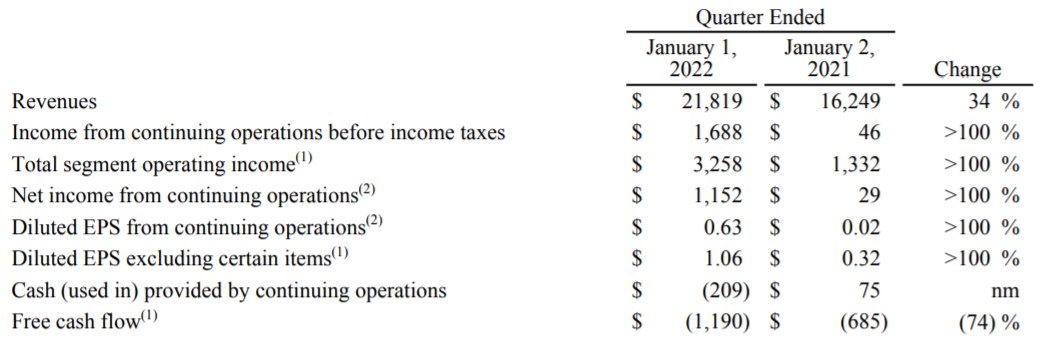 據迪士尼公布的財報資料,2022年會計年度第一季(截至2022年1月1日),營收年增34%至218.2億美元,高於Refinitiv調查所預期的209.1億美元;稀釋每股盈餘為1.06美元,擊敗市場共識預期的0.63美元。