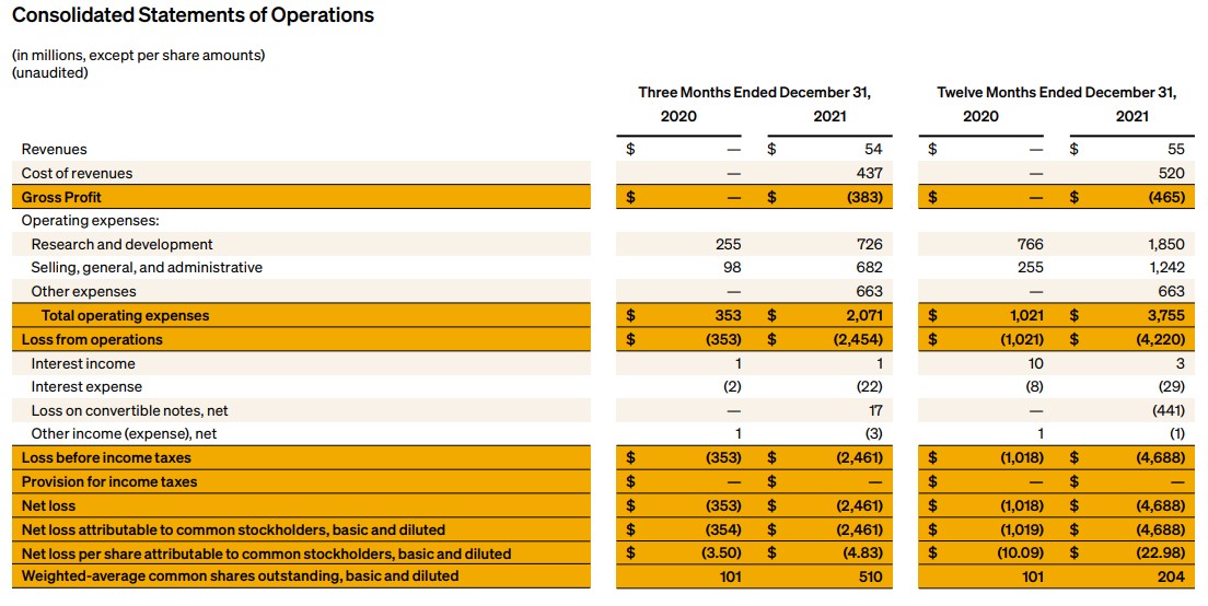 根據Rivian發布的財報資料,2021年第四季(2021年10-12月),營收5,400萬美元,低於Refinitiv共識預期的6,000萬美元;淨損24.6億美元,而去年同期為淨損3.53億美元;調整後每股虧損2.43美元,高於Refinitiv調查所預估的1.97美元。