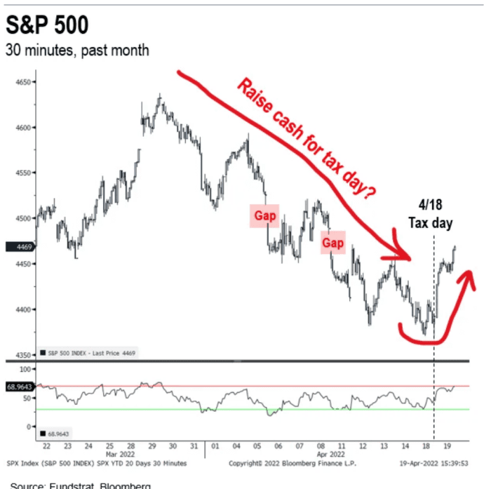 MarketWatch 19日報導,Fundstrat共同創辦人Tom Lee指出,美股從3月底開始一路往下墜(13個交易日),跌勢延續到4月18日,這天正好是民眾呈報聯邦所得稅的最後期限。
