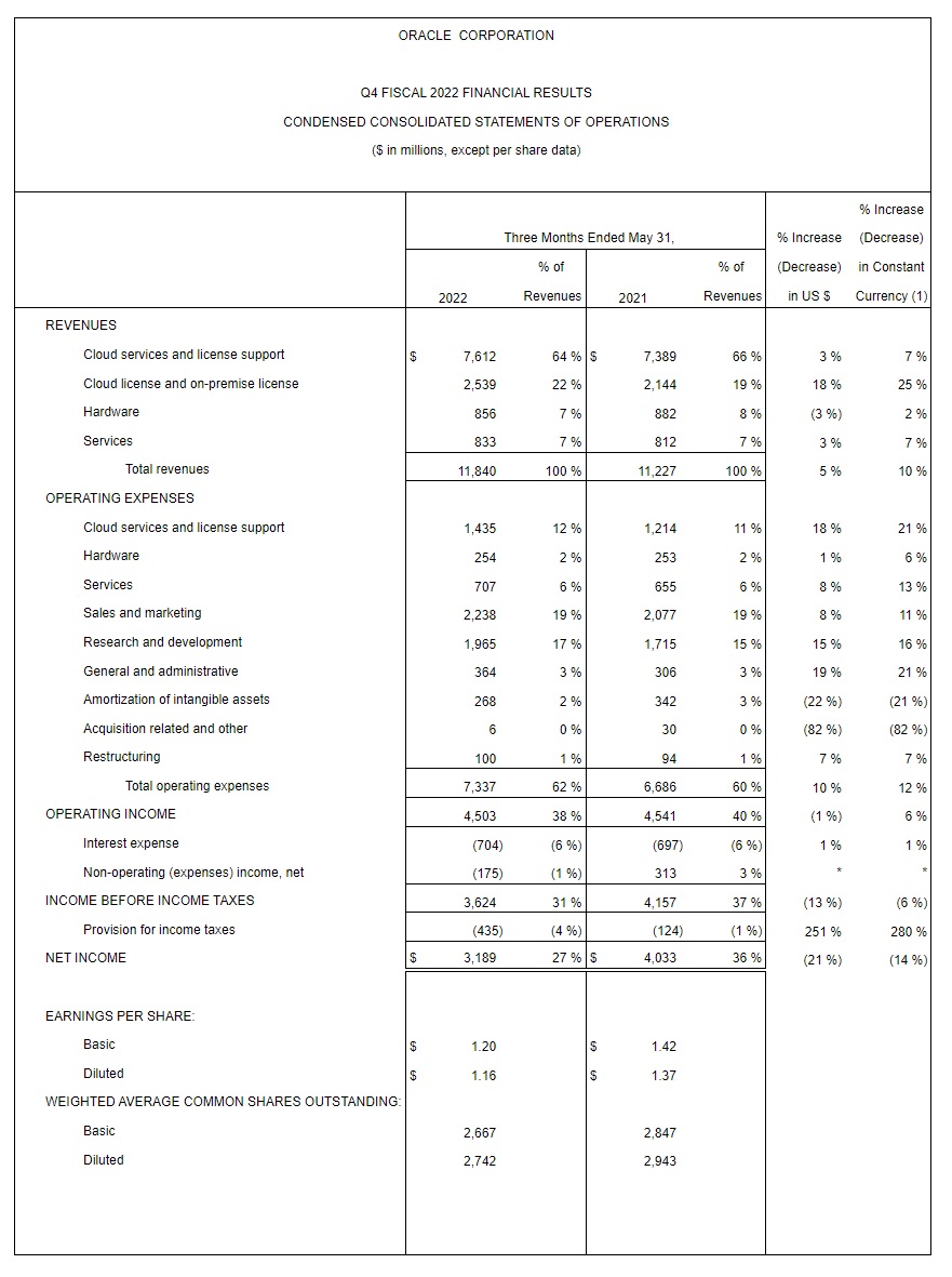 Barron’s、CNBC報導,上一財年第四季(3~5月),甲骨文營收成長5%至118億美元,優於前季的105億美元,也擊敗Refinitiv訪調估計的116.6億美元。本業每股盈餘為1.54美元,勝過市場預期的1.37美元。