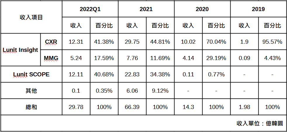 營收增速是衡量AI醫療公司成長性的關鍵條件。招股書顯示,2019~2021年,Lunit營收為1.98億、14.3億、66.39億韓圜,三年營收增長33倍。2022年第一季,Lunit營收29.76億韓圜,僅今年一季營收就占去年全年營收四成以上,遠超過2019與2020全年營收,速度真是「坐火箭」。
