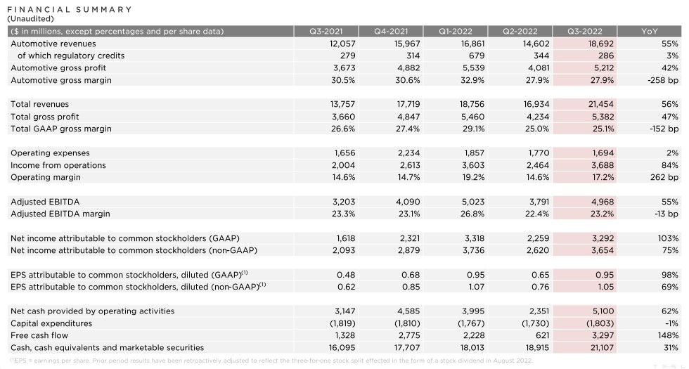 特斯拉指出,第三季營收和營業利益創歷史單季新高,主要是交車量增加、產品平均銷售價格(ASP)年增、其他事業營收增加,不過美元匯率強勢有負面影響,單季匯兌損失約2.5億美元,但營益率表現克服全球通膨導致的原物料價漲逆風。