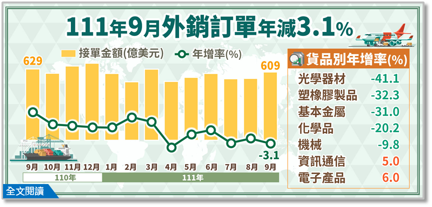 全球受通膨及升息影響,終端需求持續轉弱,經濟部 20 日公布 9 月外銷訂單 609.3 億美元,年減 3.1%,自 8 月正成長後再度翻黑,但接單金額表現超乎預期,為歷年同月次高。經濟部評估全年接單仍有可能維持正成長。
