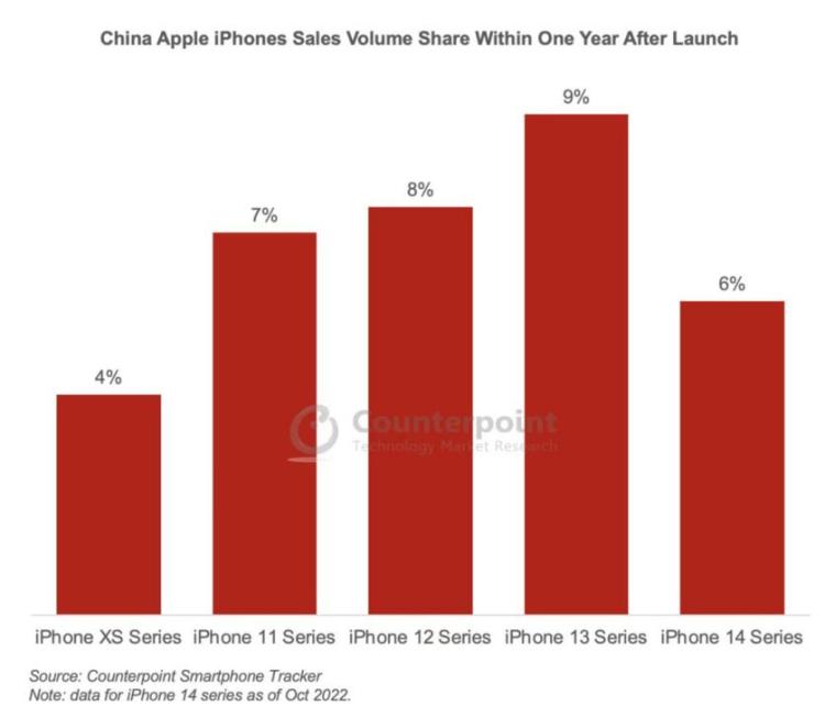 Counterpoint數據,iPhone 14系列發表後市佔率創11來新低,iPhone 15發表數字可能還會下探。但iPhone 14策略拉高價格帶,助長蘋果2022下半年手機營收勉強維持增長,但許多分析師及最新財報和市場數據都顯示,增長難在2023年持續。