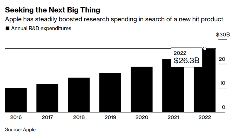 蘋果是十年內研發投資增加最快的大科技公司。2011年庫克接手時,蘋果研發營收比2.2%、研發投資24億美元的卓越硬體企業,到2022年,研發營收佔比就高達6.7%、研發投資262億美元,大概是蘋果研發投資額首次超過領先過幾年的華為。彭博稱之為蘋果努力「seeking the next big thing」的重要表現,但高額投資並不能確保蘋果的「超級專案」就此一帆風順。