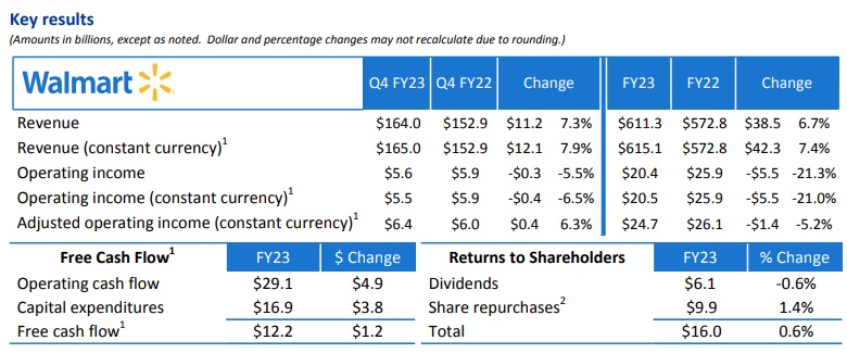 根據沃爾瑪公布的財報資料,2023會計年度第四季(截至2023年1月27日),美國同店銷售額(Comparable Store Sales,指開業至少一年的店面銷售數字)年增8.3%,高於FactSet調查所預期的4.9%;營收年增7.3%至1,640.5億美元,高於FactSet共識預期的1,597億美元;調整後每股盈餘1.71美元,亦優於分析師預期的1.52美元。