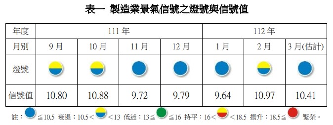 基於上述因素,整體製造業景氣信號值從2月修正後的10.97分,減少0.56分至3月的10.41分,燈號由代表景氣低迷的黃藍燈轉為衰退藍燈。