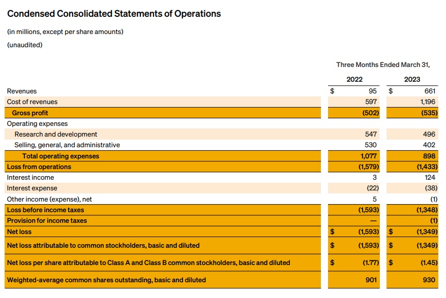 CNBC、金融時報等外媒報導,Rivian於9日美股盤後公布今年首季(1-3月)財報,營收為6.61億美元,優於Refinitiv分析師預期的6.521億美元;淨虧損收斂至13.5億美元或每股1.45美元,虧損幅度小於去年同期的15.9億美元或每股1.77美元。