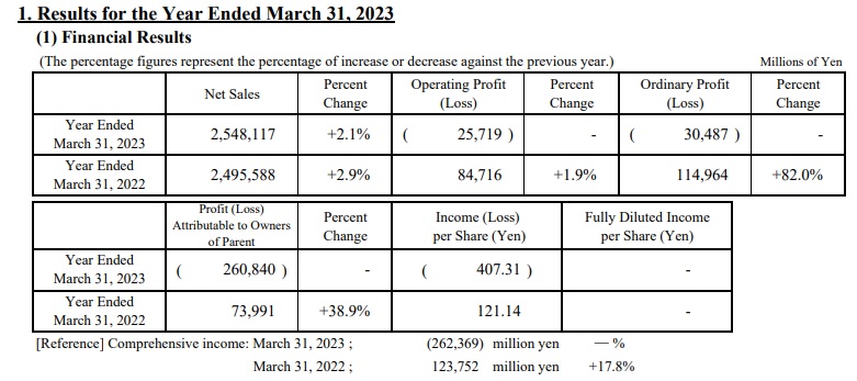 此為夏普6年來(2016年度以來,當年淨損248億日圓)首度陷入虧損,虧損額遠高於市場預估的404億日圓,虧損規模為史上第三慘,僅低於2012年度(淨損5,453億日圓)、2011年度(淨損3,760億日圓)。