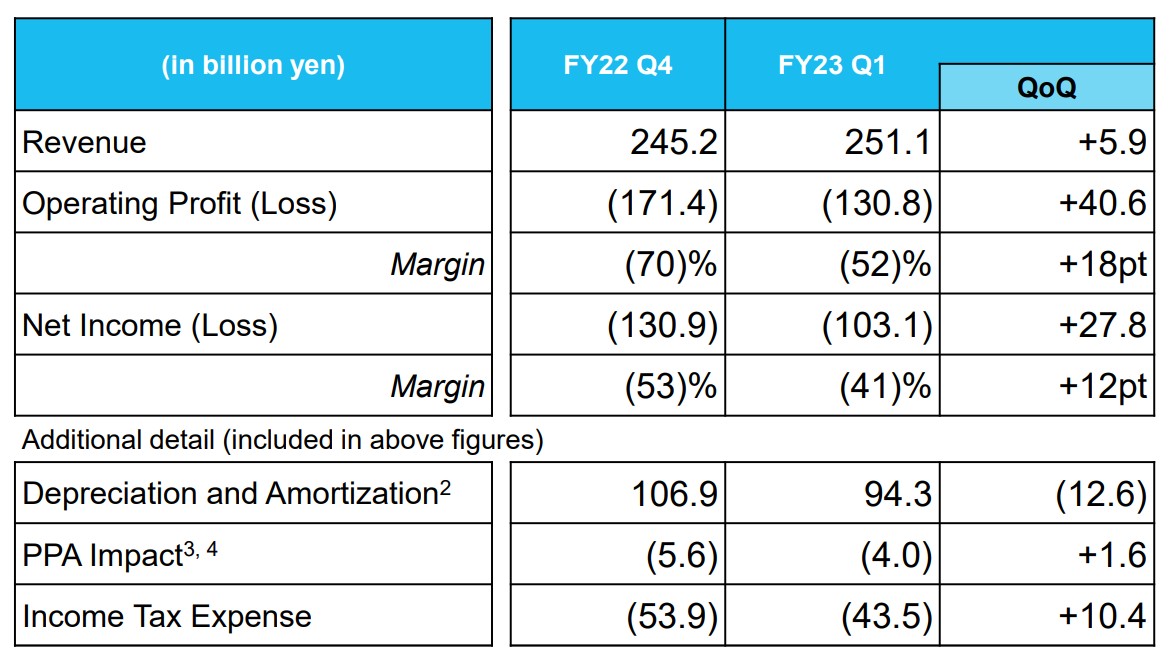 鎧俠9日公布上季(2023年4~6月)財報:因智慧手機等產品需求低迷,導致NAND Flash市況持續惡化、價格續跌,拖累合併營收較去年同期大減32%至2,511億日圓;顯示本業獲利情況的合併營益自去年同期盈餘851億日圓轉為虧損1,308億日圓,本業連三季陷入虧損;顯示最終獲利合併純益自去年同期盈餘426億日圓轉為虧損1,031億日圓,連續第三季陷入虧損,季虧損額連兩季衝破千億日圓,創鎧俠前身「東芝記憶體」2017年4月上路後第二慘(僅低於2023年1~3月虧損1,309億日圓)。