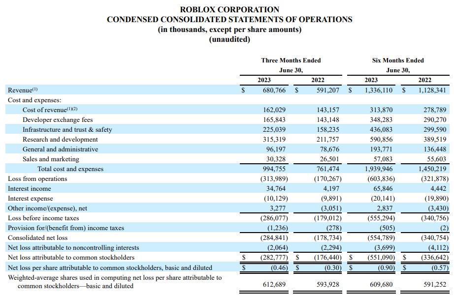 MarketWatch、Investopedia等外媒報導,Roblox公布,今年第二季(4~6月),營收年增15%至約6.808億美元,但淨虧損達2.828億美元或每股46美分,虧損較去年同期的1.76億美元擴大。重要營運指標「預收收入」(Bookings)年增22%至7.807億美元,但略低於分析師預估的7.87億美元。