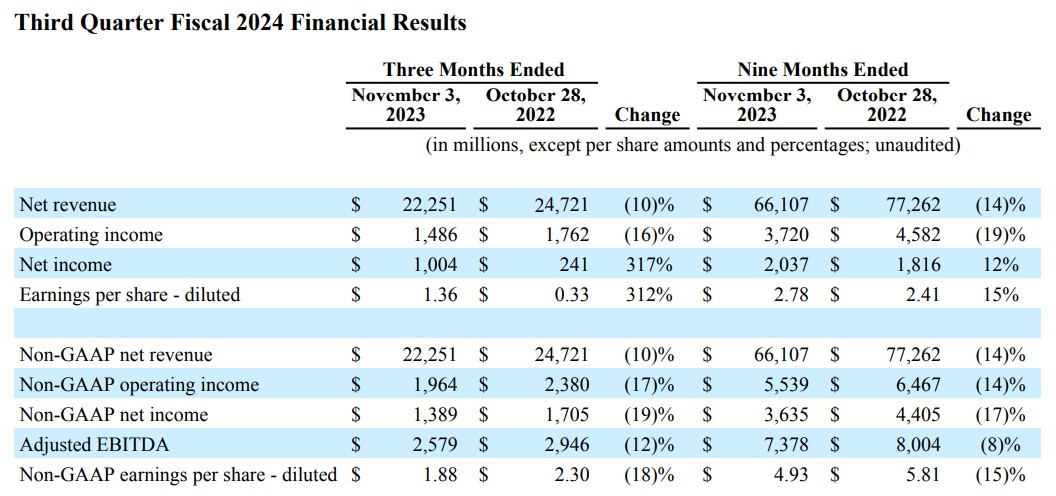 根據戴爾公布的財報資料,2024會計年度第三季(截至2023年10月31日),營收年減10%至223億美元,低於FactSet共識預期的230億美元、財測區間中點230億美元。