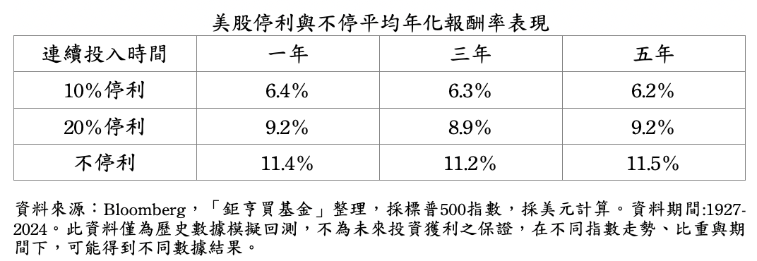 鉅亨買基金分析,自 1927 年以來,假設每年年底投入美國股市,每月底檢視該年至今報酬率,若超過停利目標便全數賣出,等到年底再將資金投入;停利目標設為 10% 時,連續投入三年的平均年化報酬率為 6.3%;停利目標提高至 20%,平均年化報酬率是 8.9%,但是如果不停利出場,平均年化報酬率則可提高到 11.2%,張榮仁表示,跟對趨勢投資,累積財富的效率更能提高。