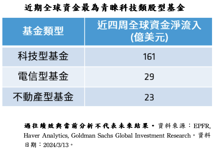 聯博投信認為,從三大優勢來看,預估今年科技股仍是驅動股市的關鍵動能,但選股至關重要,特別是要避開那些評價過於昂貴但獲利前景仍待商榷的個股,首先優勢一就是資金加持,從全球資金流向來看,近四週產業型基金以科技股淨流入 161 億美元最佳,顯見在 AI 人工智慧發展的起飛階段,投資人對科技股仍相對有信心。