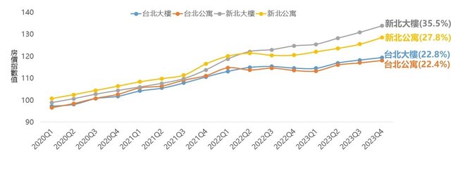 「政大永慶房價指數」亦比較七大都會區的「大樓房價指數」。數據顯示,台北和新北的大樓漲幅低於4成之外,桃園、台中、台南、高雄的大樓漲幅在51.3%至66.1%之間,幅度驚人。其中新竹縣市的大樓產品在2020Q1至2023Q4間,更飆出91%的漲幅。