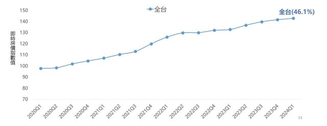「政大永慶房價指數」以台灣最近一波房地產價格開始走揚的2020年做為起點,自2020年Q1至2024Q1,四年多來全台房價上漲高達46.1%。