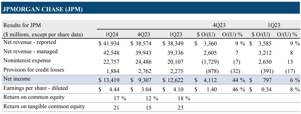 根據摩根大通公布的財報資料,2024年第一季,營收年增9%至419.3億美元;淨利年增6%至134.2億美元,即每股盈餘4.44美元,優於LSEG調查所預期的4.11美元,而2023年同期為淨利126.2億美元,即每股盈餘4.10美元。