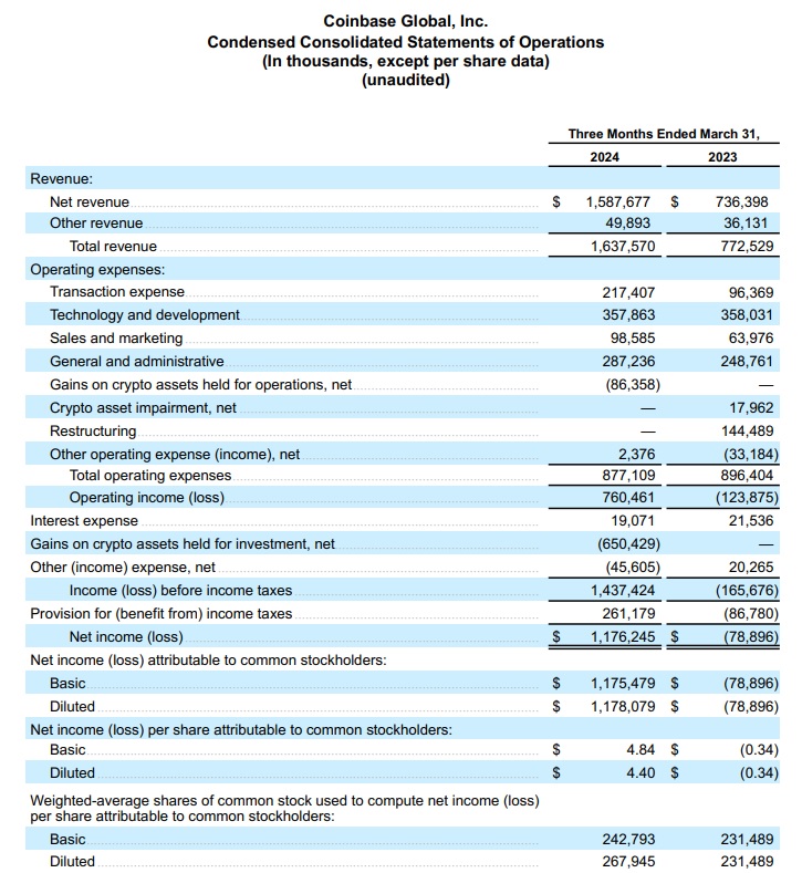 根據Coinbase公布的財報資料,2024年第一季,營收淨額(Net Revenue)16.4 億美元,高於LSEG調查所預期的13.4億美元;淨利由虧轉盈達11.8億美元,即每股盈餘4.40美元,遠優於LSEG共識預期的1.09美元,而去年同期為淨損7,890萬美元,即每股虧損0.34美元。