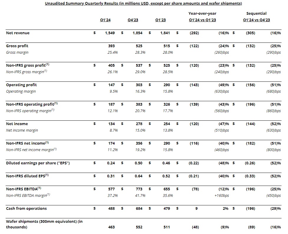 根據格羅方德5月7日發布的財報,2024年第一季(截至2024年3月31日),營收年減16%至15.5億美元,但優於FactSet調查所預期的15.2億美元,並超出財測區間15億美元至15.4億美元。