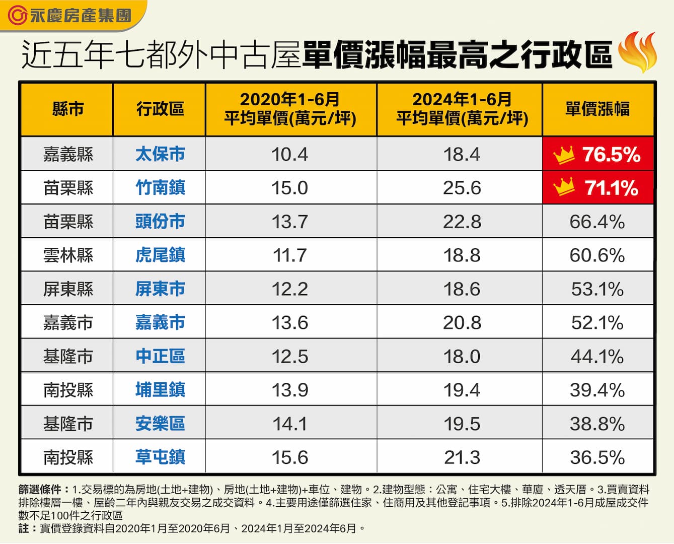 全台房價有感上漲,除房市交易量最大的七大都會區外,其他縣市的房價受到經濟前景看好、區域發展影響上漲。永慶房產集團比較近五年上半年,其餘 11 縣市各行政區的中古屋平均單價變化,發現嘉義太保飆漲 76.5% 最高,苗栗竹南、頭份破 65% 的增幅位居第二、第三。