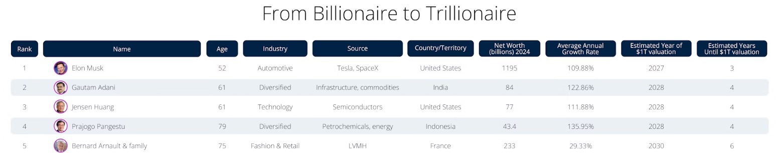 英富曼(Informa)跨國集團旗下的研究院Informa Connect Academy近來公布的「2024兆美元俱樂部」(The 2024 Trillion Dollar Club)報告中,以馬斯克較高的身價做為基準,推算出他最快將於2027年達到1兆美元富翁這個里程碑。
