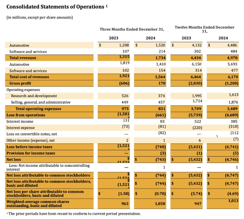 華爾街日報、MarketWatch等外媒報導,Rivian於20日美股盤後公布,2024年第四季毛利達1.7億美元,達成毛利首度轉盈的目標。當季營收年增32%至17億美元,較預期高出約3億美元,經調整每股虧損為46美分,優於FactSet統計的分析師預估值虧損63美分。
