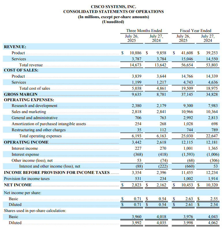 網路通訊設備業大廠思科(Cisco Systems, Inc.)於美國股市週三(8 月 13 日)盤後公布 2025 會計年度第 4 季(Q4,截至今年 7 月 26 日為止)財報:營收年增 8% 至 147 億美元,非依照美國一般公認會計原則(non-GAAP)每股盈餘年增 14% 至 0.99 美元。