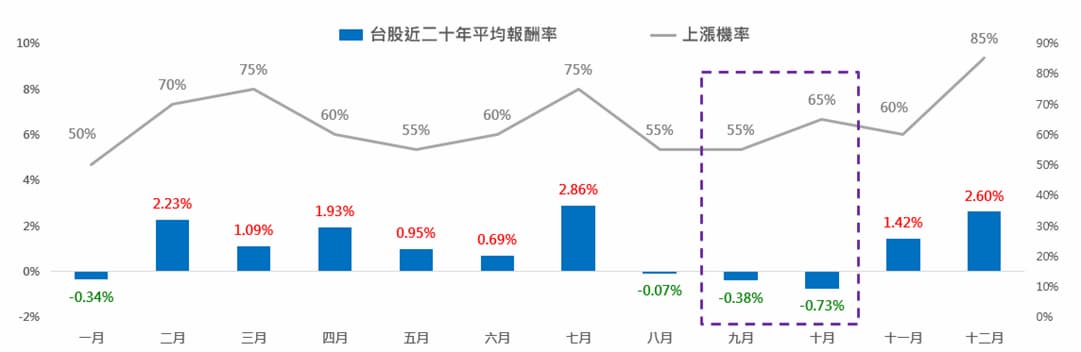 台股第三季創高後,隨著四大連續假期接連登場,市場憂心今年不只有「中秋變盤」的節日效應,加權指數陷入震盪,台股今日大漲 240 點,再度叩關兩萬六大關,終場收在 25820.54 點。國泰投信表示,統計過往 20 年台股走勢,10 月雖為報酬率最低的月份,但上漲機率已逐漸升高。