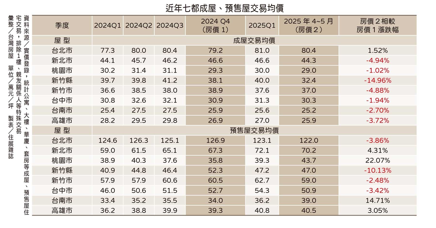 《住展雜誌》委請台灣房屋統計限貸令前後七都房價漲跌情形,結果發現,無論是預售或成屋市場,目前新竹縣、市與台中市皆呈現雙雙下修,已成「雙降區」。成屋市場中,僅台北市仍勉力守住微幅上漲。但整體看來,限貸令後遺症持續發酵,實際交易現場已悄然出現轉向跡象。
