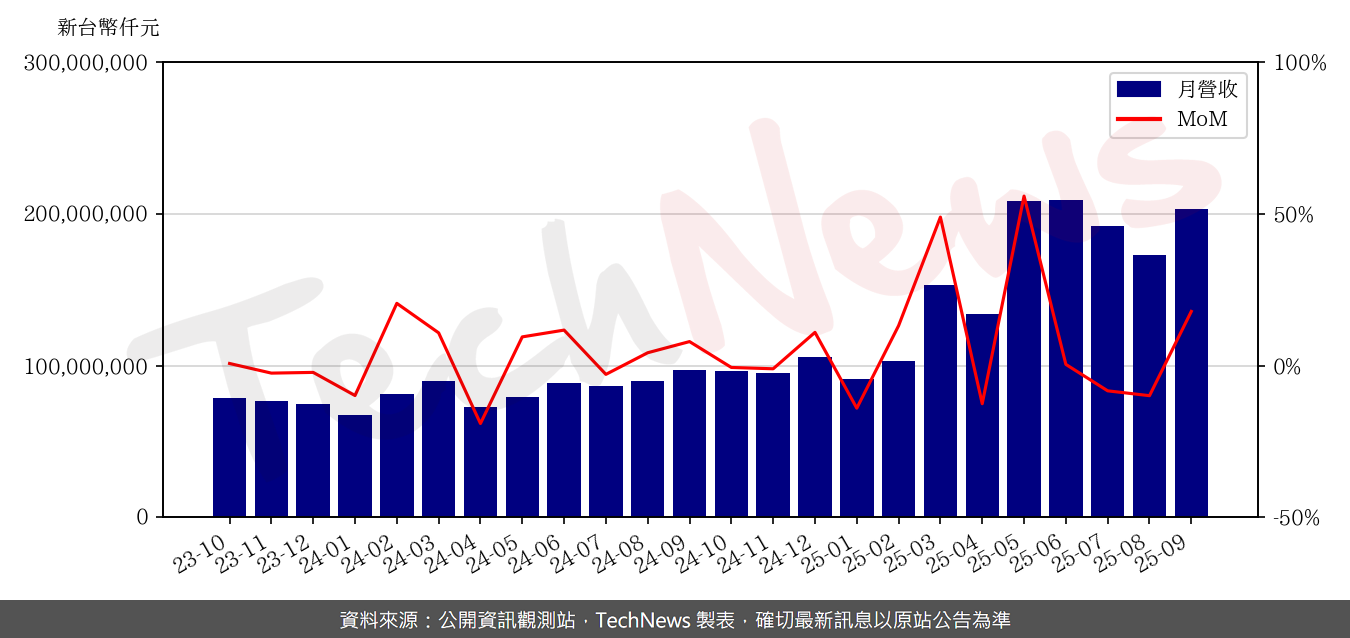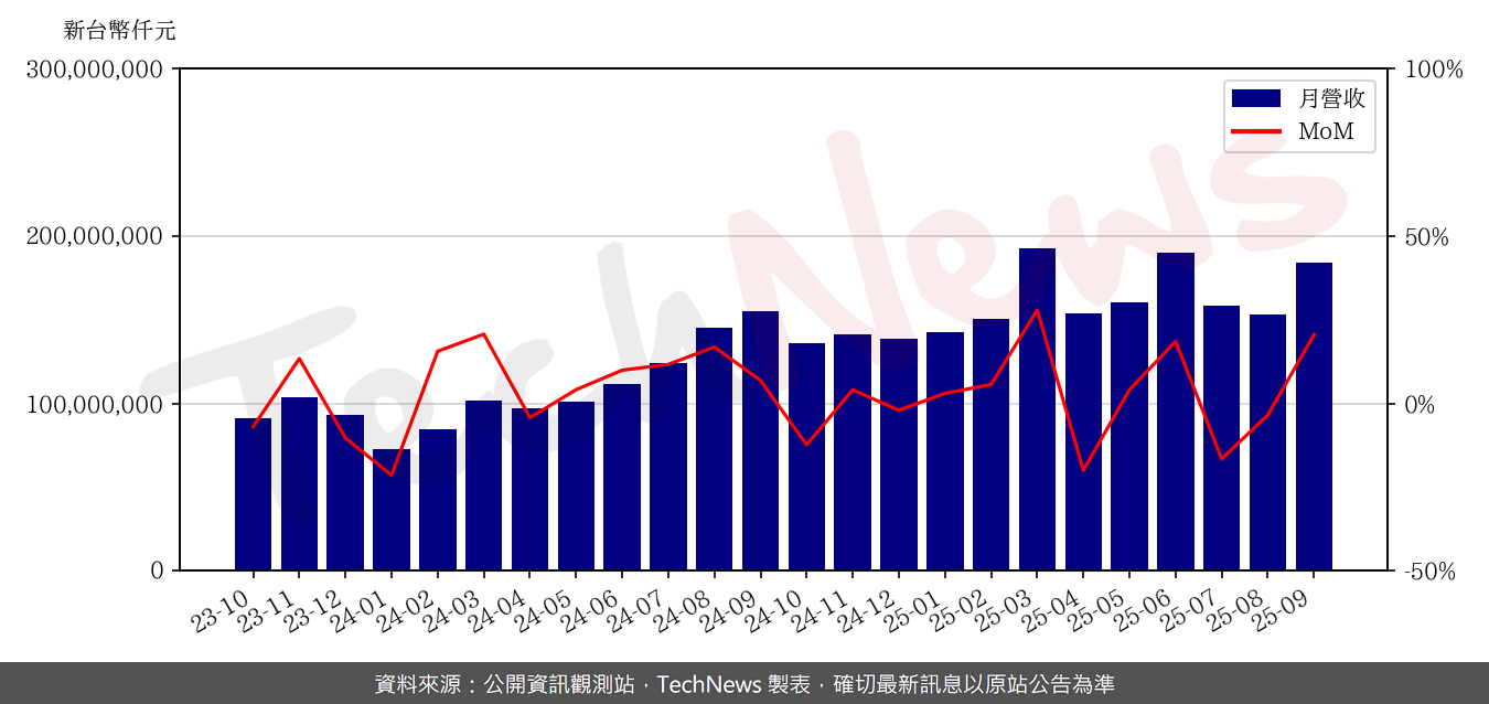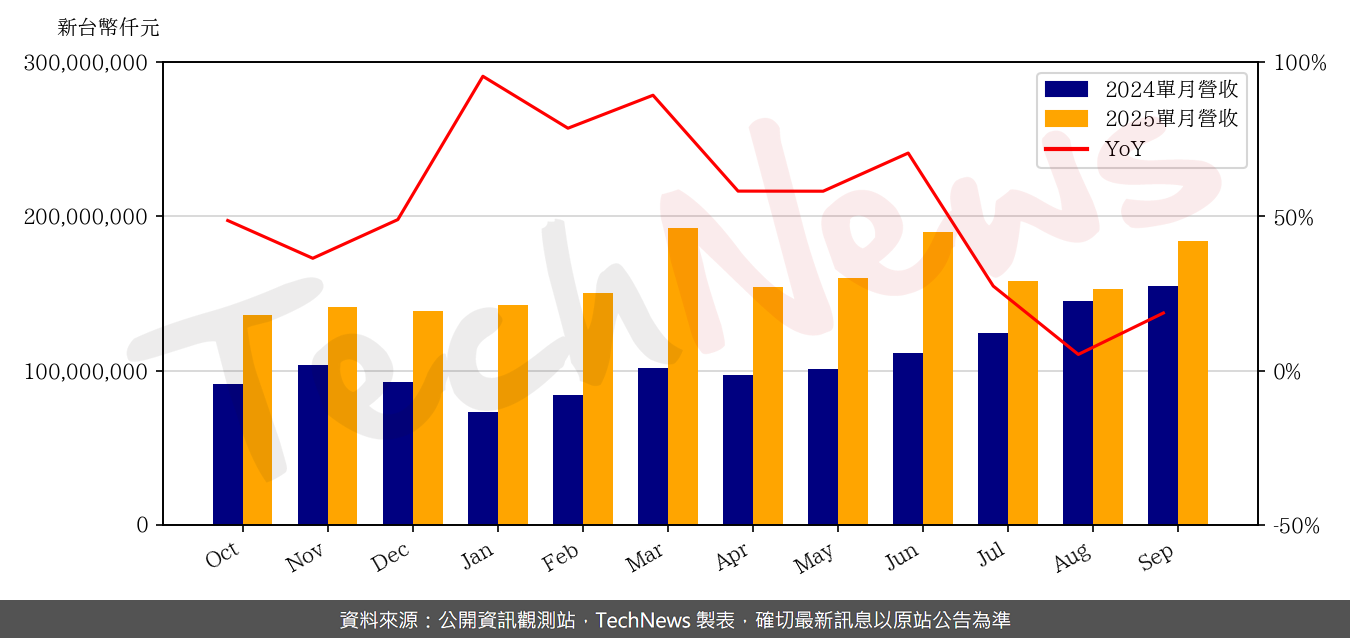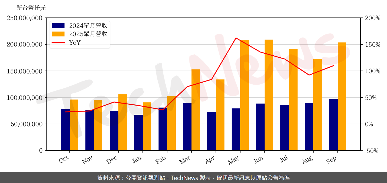 廣達9月合併營收約1841.09億元,月增20.5%,年增18.7%,也改寫歷年同期新高;今年前三季累計營收1.485兆元,年增49.5%。