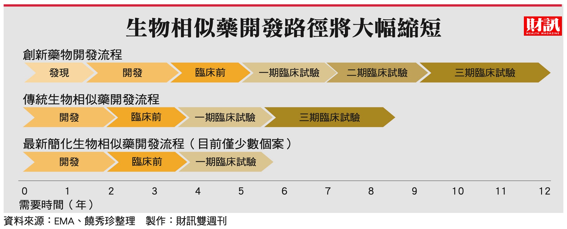 《財訊》指出,現今全球十大暢銷藥,幾乎都是生物製劑的天下。IQVIA報告,十年內將有總市場價值高達2,340億美元的118種生物製劑失去專利權,平均每年12種生物製劑專利到期,是過去十年的兩倍,90%目前沒有生物相似藥的開發,意味有極為龐大的市場待開發。