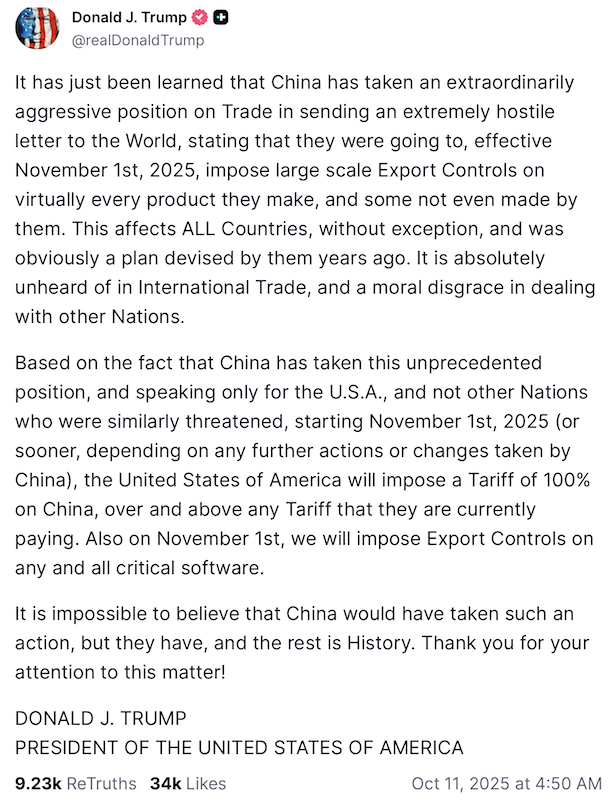 國總統川普(Donald Trump)今天表示,鑒於中國對稀土礦物實施「極其激進」的出口管制,他將自11月1日起對中國進一步徵收 100% 的關稅。