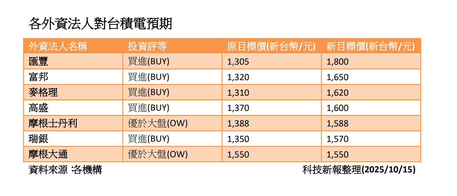 晶圓代工龍頭台積電即將於 16 日召開 2025 年第三季法說會,並將公布第三季財報。而就在法說會召開前夕,國內外多家主要外資與法人機構,包括富邦、匯豐(HSBC)、摩根士丹利(MS)、高盛(GS)、摩根大通(JPM)、瑞銀(UBS)以及麥格理(MQ)等都對其業績看好按讚,紛紛上調其目標價及獲利預估。機構普遍認為,在 AI 需求持續熱絡、先進製程價格調漲、以及近期有利匯率條件的多重利多之下,台積電的營收及毛利率表現將優於預期。