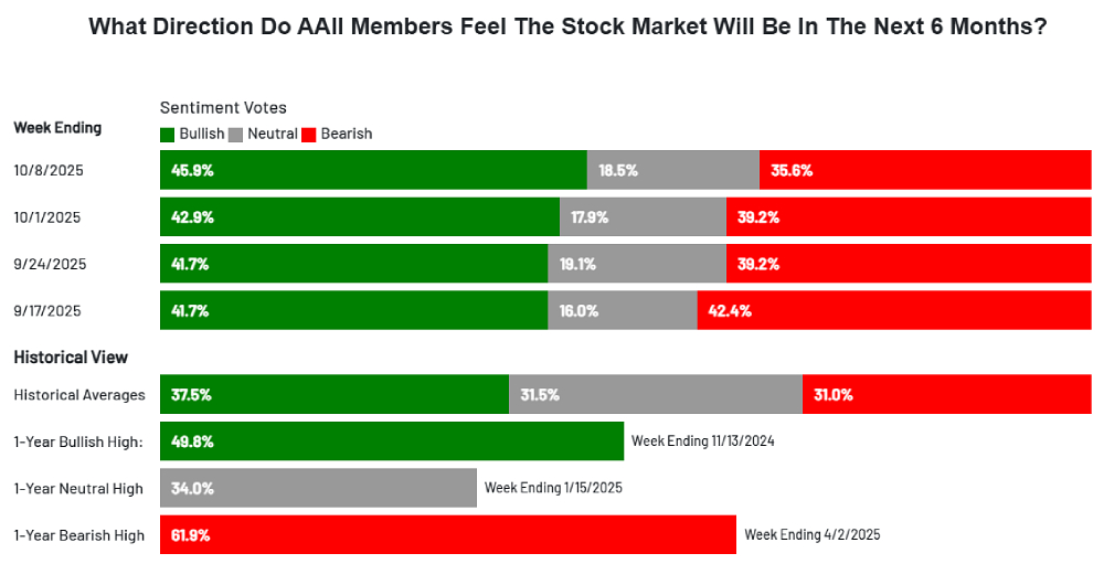 根據美國個人投資者協會(AAII)9日公布的調查結果,截至2025年10月8日為止當週預期未來半年美股走高的散戶比例自前一週的42.9%升至45.9%,創2024年12月4日當週(48.3%)以來最高,連續第四週高於歷史平均值(37.5%)。