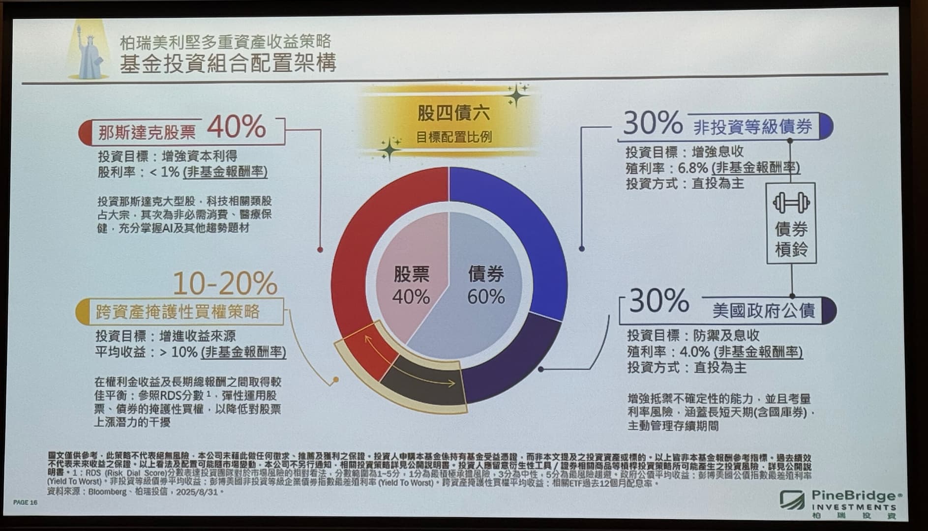 江仲弘認為,這樣的策略所建構的基金投組目標配置比例為,40% 的那斯達克 100 指數,美國政府公債和非投資等級債各 30%,並透過股息、債息、權利金的利息多重引擎搭配,來掌握全方位的收益機會,並透過這樣靈活的投組配置策略,有機會優於傳統股四債六或股六債四。