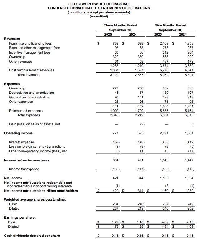 華爾街日報、MarketWatch等外媒報導,希爾頓公布,第三季營收年增8.8%至31.2億美元,優於分析師預估的30.1億美元,獲利增至4.2億美元,經調整每股盈餘為2.11美元,優於FactSet調查的分析師預估值每股2.05美元。