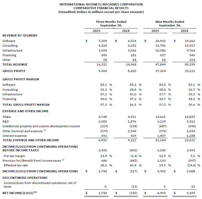 根據IBM最新財報,2025年第三季,營收年增9%至163億美元,優於LSEG統整分析師預期的160.9億美元;淨利17.4億美元,即每股盈餘1.84美元,優於去年同期為淨損3.3億美元,即每股虧損0.36美元,當時虧損主因是認列退休金成本27億美元。