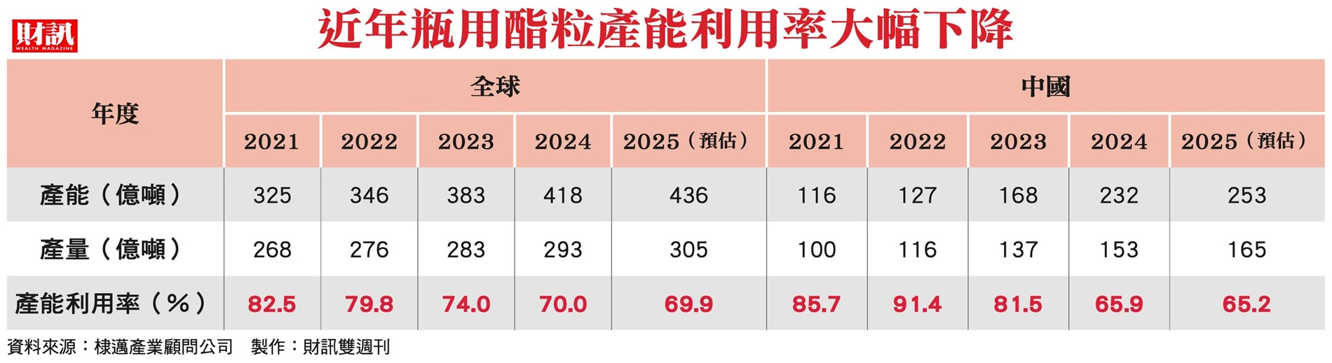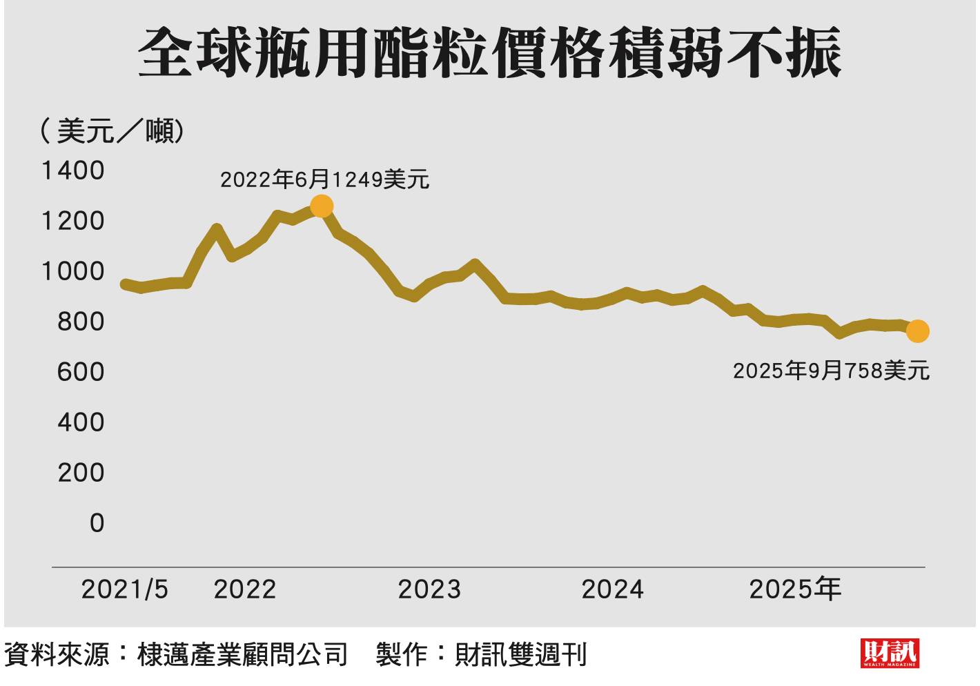 據統計,2020年起全球酯粒產能一路供過於求,即使山樟、逸盛、萬凱等中廠降負荷、檢修控庫,仍難止住價格崩跌;瓶用酯粒報價自2022年高點每公噸約1,250美元,跌至今年9月僅758美元,跌幅四成。