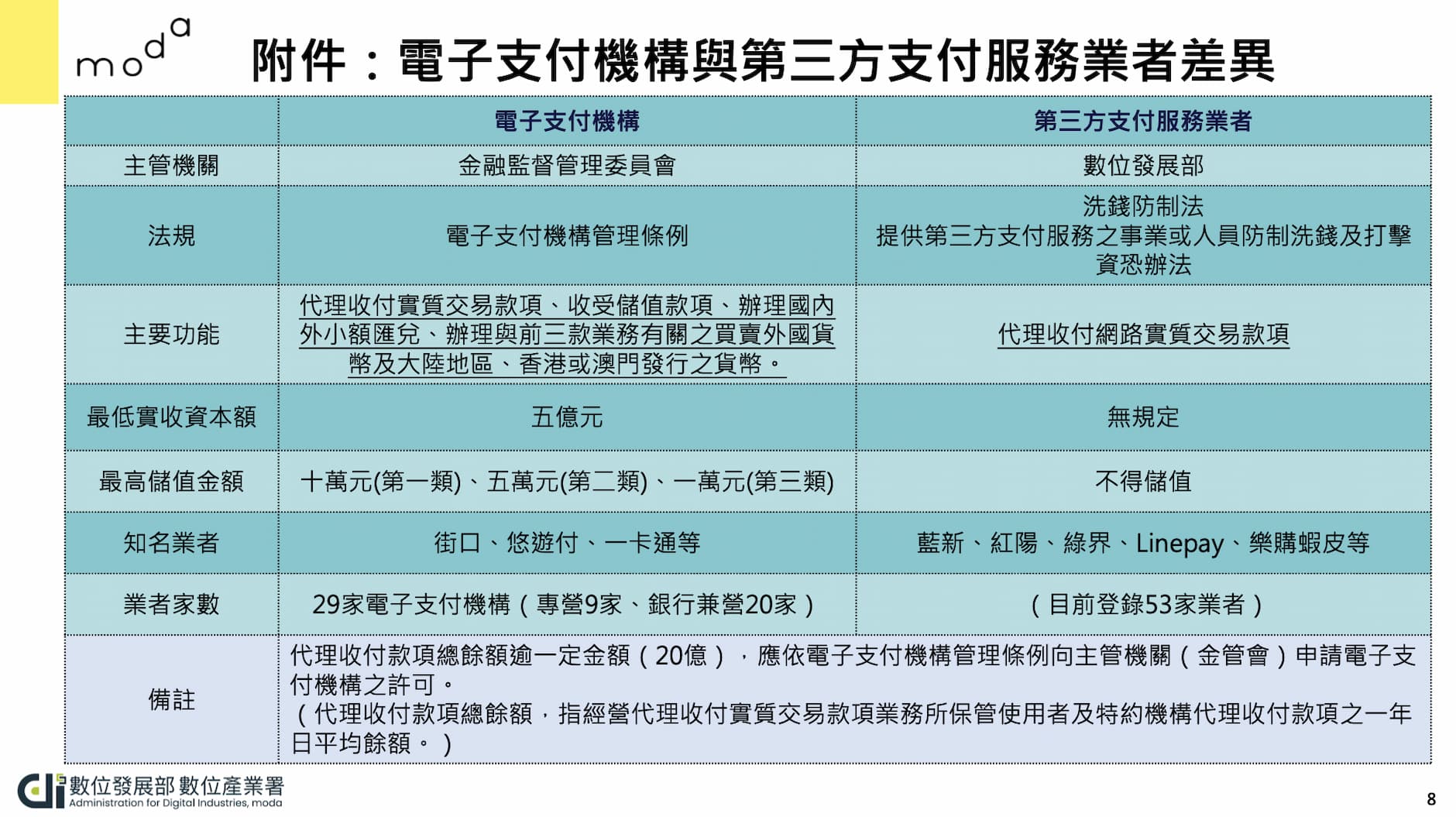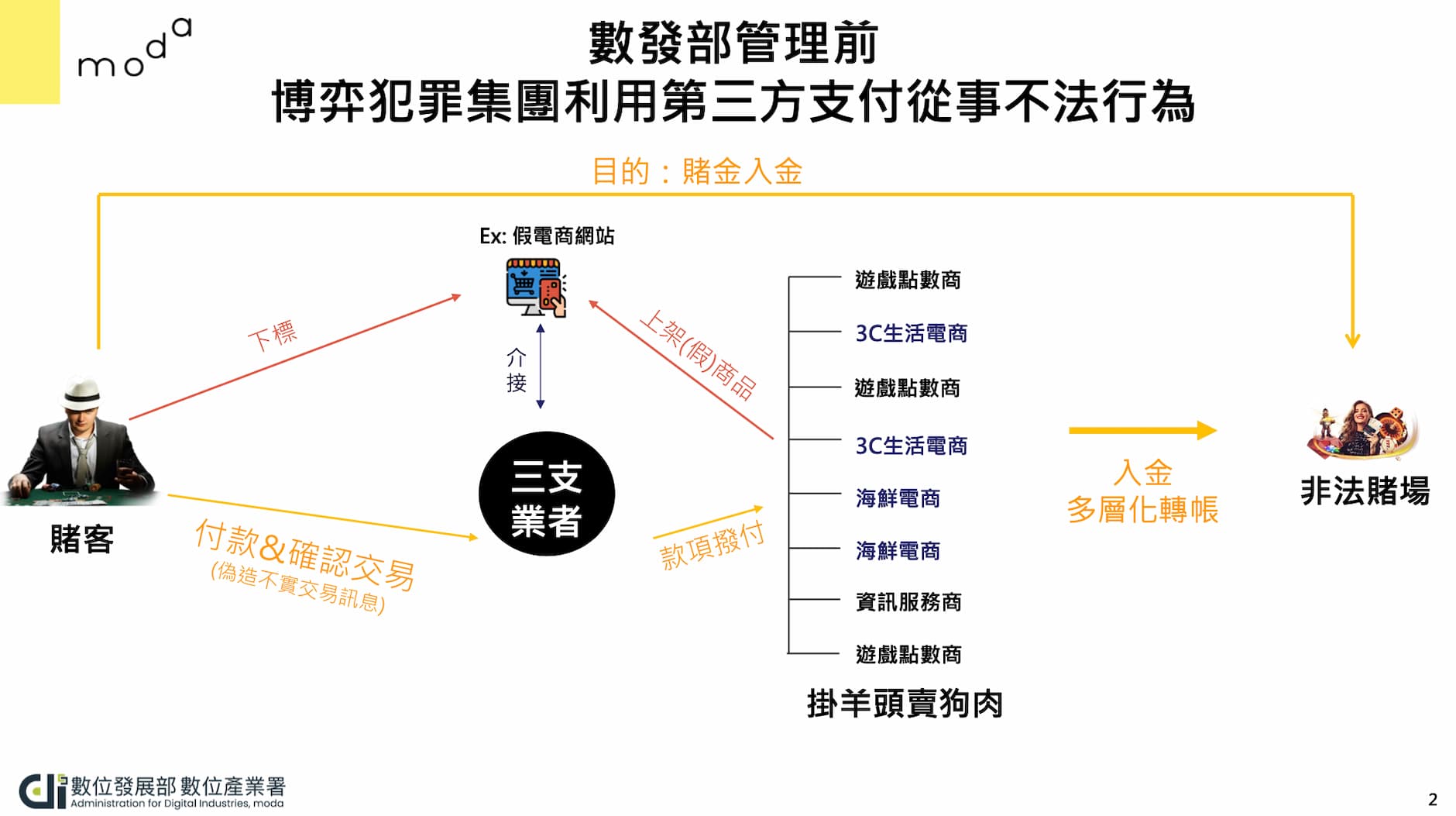 數發部表示,第三方支付服務業者提供多元的支付管道,促進微型電商蓬勃發展,博弈集團看中支付管道便於賭客入金,進而鎖定第三方支付從事不法洗錢行為,為杜絕此類不法洗錢行為,數發部成立後納管第三方支付服務業者,並在 2023 年 7 月創立服務能量登錄制度。