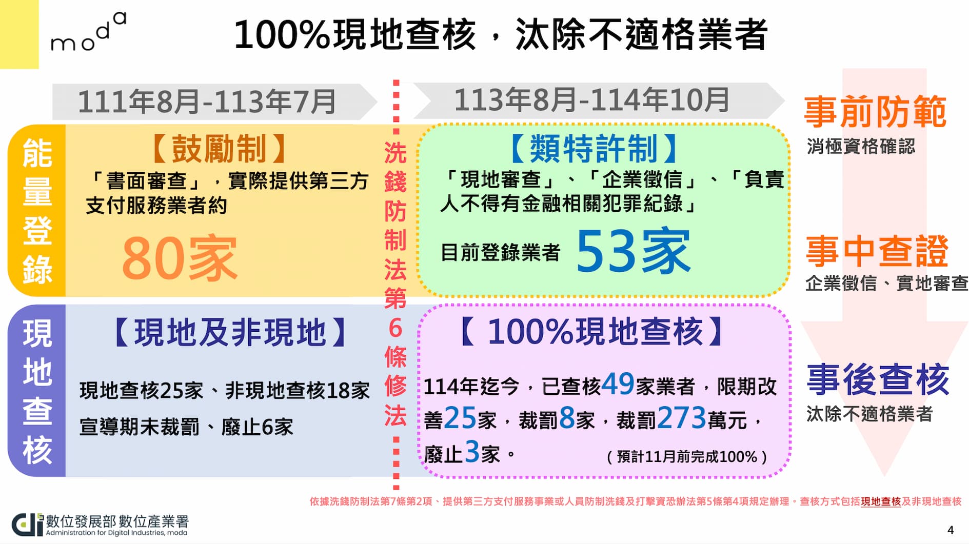 數發部分享,數發部今年開始啟動全面性實質審查及現地查核機制,針對第三方支付服務業者的能量登錄新申請審查、能量登錄展延期限審查及洗錢防制現地查核等多層次管理機制,迄今已至 69 家業者營業處所,辦理 112 場實質審查及現地查核,顯示防制洗錢的高執行力度與決心。