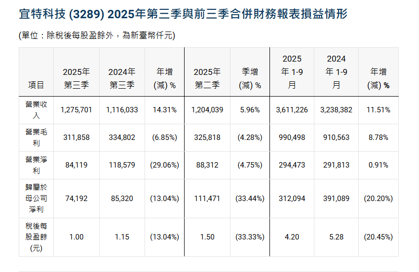 宜特公布 2025 年第三季財報,合併營收為新台幣 12.76 億元,較上季增加 5.95%,較 2024 年同期增加 14.31%。營業淨利 0.84 億元,稅後歸屬母公司淨利 0.74 億元,EPS為 1.00 元。累計 2025 年前三季,合併營收為新台幣 36.11 億元,較 2024 年同期成長 11.51%。歸屬母公司稅後淨利 3.12 億元,EPS為 4.20 元。
