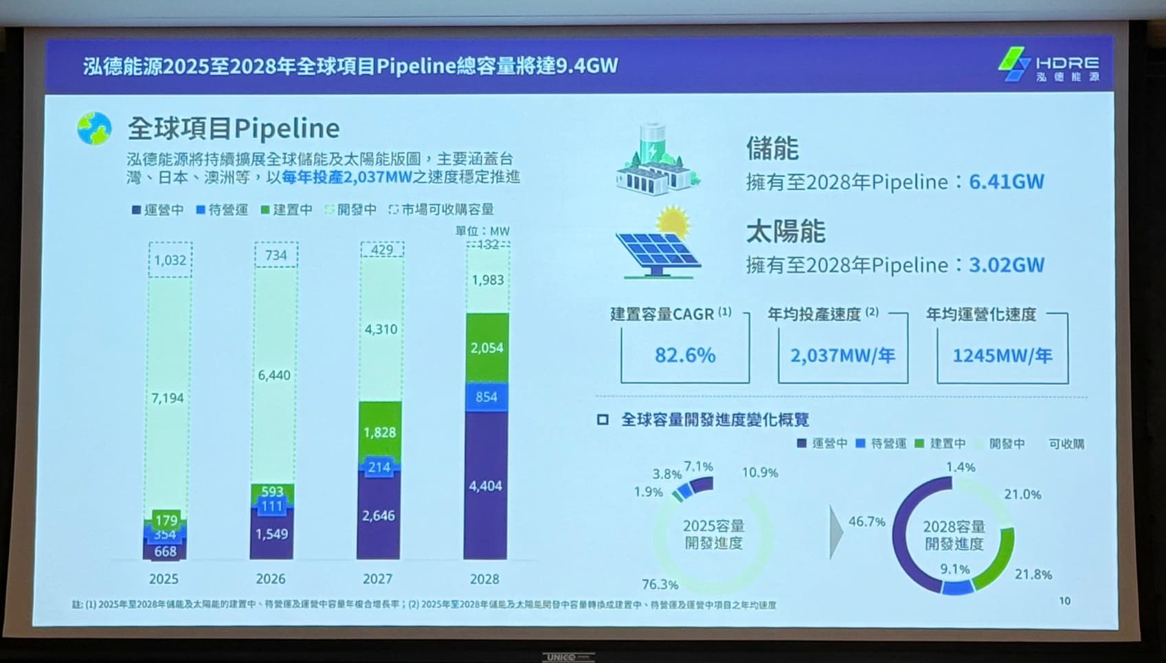 泓德能源今年參與「2025 台灣智慧能源週暨淨零永續展」,總經理周仕昌表示,隨著 AI 與資料中心的需求快速成長,預計至 2028 年全球總開發容量將達 9.4GW,其中儲能占 70%,而日、澳案場年底商轉,海外營收占比顯著提升,預計 2027 年貢獻超過 55%,至於星星電力將在明年興櫃。