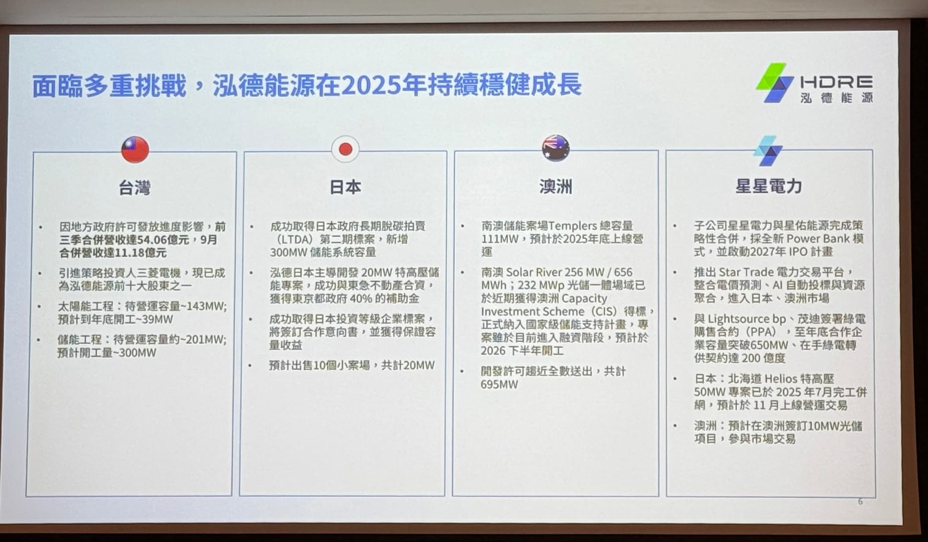 周仕昌分享,全球市場方面,日本持續聚焦儲能項目開發,泓德能源預計 2028 年完成建置 3.4GW,其中與 Brawn Capital 共同開發的北海道 Helios 特高壓 50MW 儲能案場已在今年 7 月完工併網,預計 11 月啟動營運,並投入電力交易。